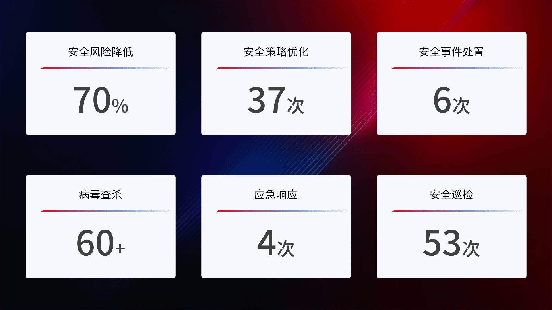 提供全面的安全事件报告体系,,,,包括处置报告、、、、周报、、、季度和年度总结,,,,结合持续监控,,,帮助客户深入了解网络安全状况。。