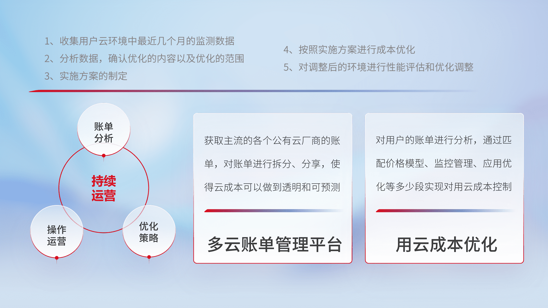 通过灵活运用多种自动化迁移工具,,,,帮助企业用户实现业务和数据高效 、、稳定的上云迁移和云上迁移,,,采用自研多云纳管平台,,,以中立管理模式,,解决多组织、、多云、、、、多运维厂商的复杂关系的管理,,,保证多云平台资源配置的一致性,,,,实时掌控云资源运行数据,,运用智能化工具分析云资源多云平台的管理服务,,,,透明化管理成本支出,,,,用云成本可预测、、用云费用可优化、、、、云资源配额有据可依。。。。