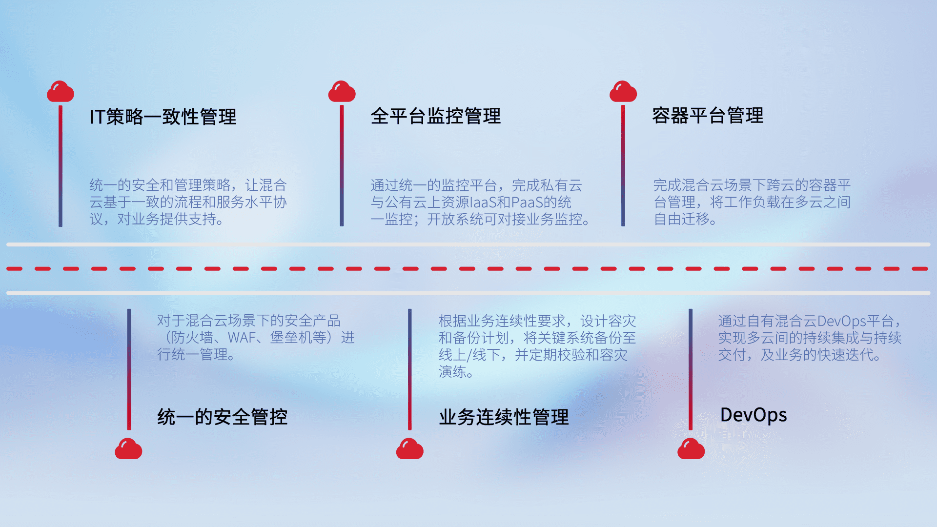 通过多云纳管,,以统一的资源数据模型把客户的云资源进行抽象和封装,,,进而实现对多云资源的统一操作,,,,保障云资源管理的可靠性、、、稳定性与可用性。。量身定制化运维内容,,,配置、、、、开发运维、、补丁管理、、、备份、、监控、、、、认证和访问管理、、、、审计和日常巡检等,,,,保障在用云过程中的可靠度,,稳定度以及高可用率。。。。